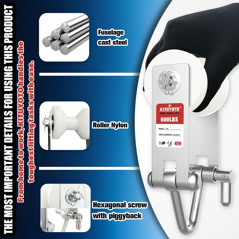 - 1. SMOOTH & QUIET ROLLING: Nylon roller with internal ball bearings glides effortlessly and quietly on round pipes – no lubrication needed, maintenance-free