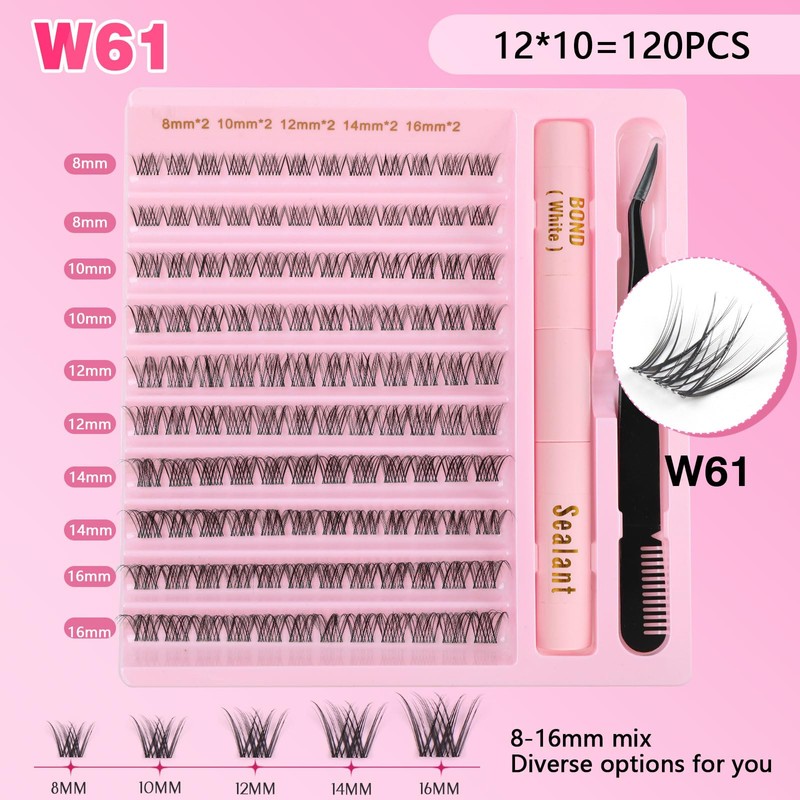 Kiusatig Eyelash Extension Kit 120PCS DIY Lash Extensions Kit Cluster Lashes Kit D Curl 8-16mm False Eyelashes Individual Eyelashes Kit with Lash Bond and Seal Lash Tweezers Kit (8-16Mix Kit)