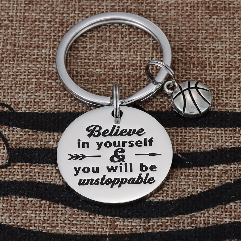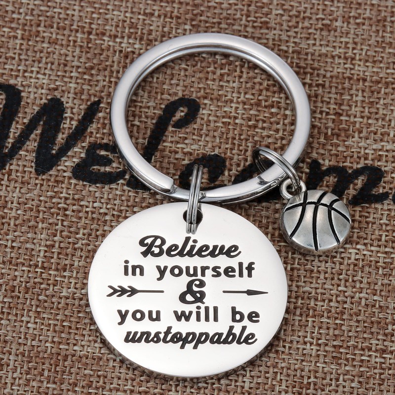 - đź’—Basketball Keychain, Basketball Player Gifts Keychain for Men and Womenđź’—----This keychain with design hand engraved "Believe in Yourself & You Will Be Unstoppable" with a basketball charm.This inspirational keychain makes encouragement gifts for basketball team, basketball lovers, coach.