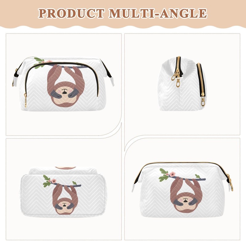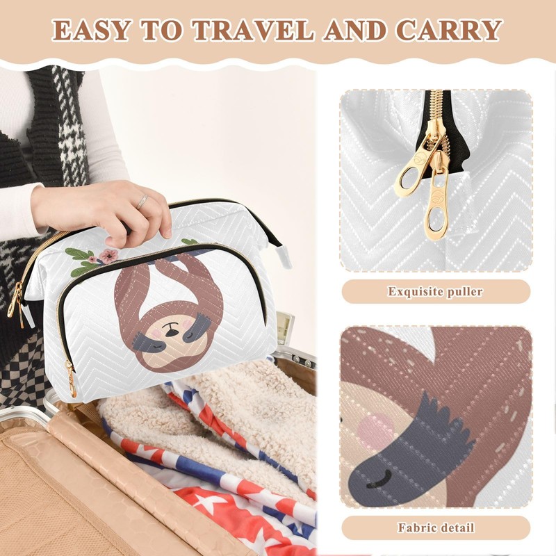 Kjovgcb Women Wave Quilt Cosmetic Bag, Zipper Toiletry Storage 10.2x5.9x6.7 in, Pouch Handbag Makeup Case Purse Holder Organizer Print Sloth On Tree Trunk With Flowers