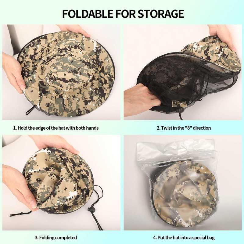 - Foldable steel hat brim design: This mosquito hat has a double-layer foldable steel hat brim that can be rotated in the direction of an "8". After folding, it saves space and is easy to carry. The stretch steel wire at the bottom of the hat prevents mosquitoes or other people from getting too close to the face while providing better visibility.