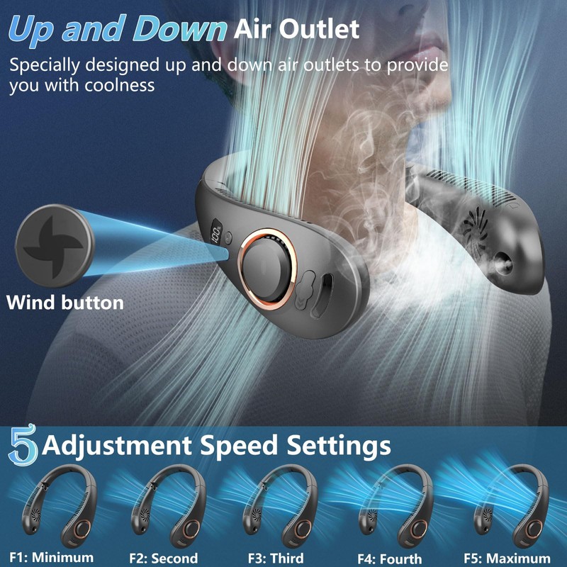 - 🔋【Up&Down Wind Cooling Neck Fan】KJXIC neck fans with innovative design of the upper and down wind air outlets can not only provide the face cooling wind, but also make your chest cold, bringing you more coolness.5 adjustment fan speeds for you to flexibly choose the appropriate wind to achieve a personalized comfortable experience.4000mAh Long lasting battery life up to 3-7 hours (depending on wind speed and spray mode,and these 2 functions can work independently)