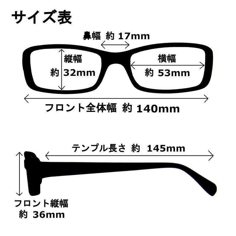 - フレームサイズ表記 53口17-145 全体幅約140mm(こめかみ部分155mm程度までは無理なく広がります) レンズ横幅約53mm レンズ縦幅約32mm テンプル長さ約145mm 重さ約17g