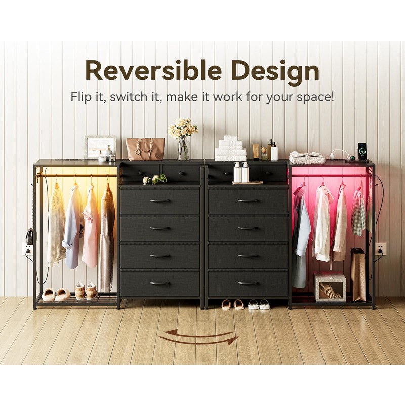 KKL Dresser for Bedroom with Clothes Hanging Rack, Reversible Bedroom Dresser with Shoe Rack & 6 Fabric Drawers, 3-in-1 Storage Chest of Drawers with Led Lights & Charging Station for Closet, Black