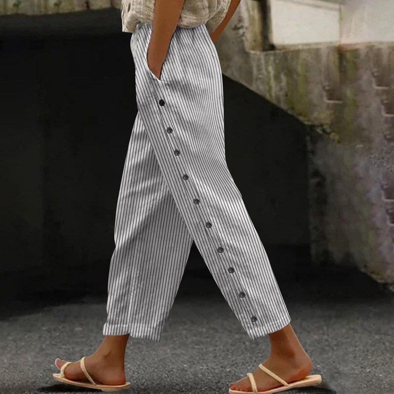 - Styling: The sleek, alternating stripes in calming hues add visual interest without overpowering the outfit, making these trousers a versatile styling piece. The side button detail not only enhances the trouser's aesthetic appeal but also offers a practical, secure fit.