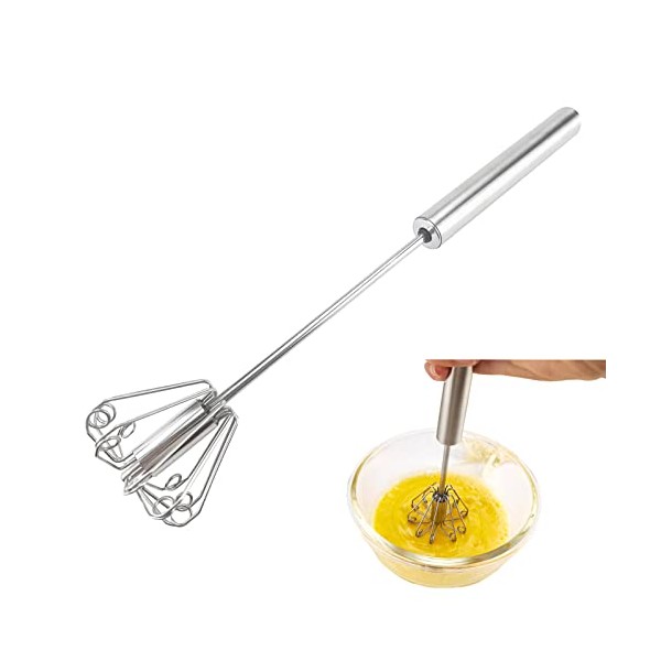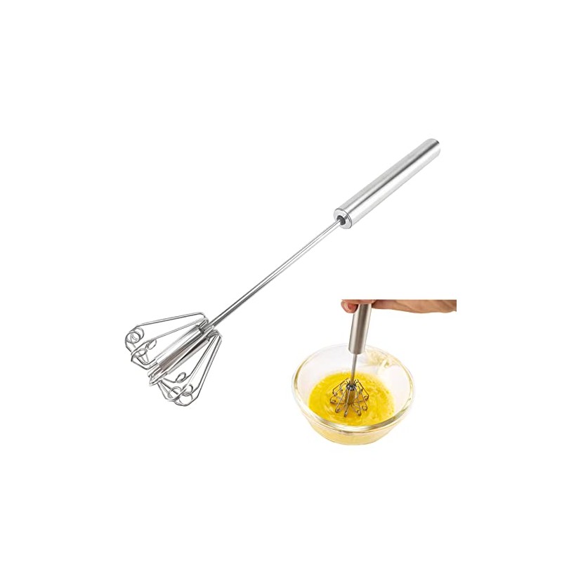 • EFFICIENT AND ENERGY SAVING: The innovative semi-auto design can eliminate unnecessary hand movements and speed up the whisking process. All you have to do is press down, then the whisk will start spinning on its own. you can quickly get evenly mixture. This rotary whisk plays a better role in a large mixing cup or bowl for liquid mixing