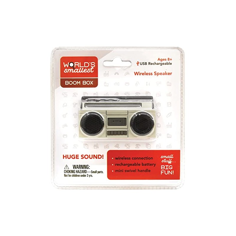Worlds Smallest Boom Box. Wireless speaker. Wireless connection. Rechargeable battery. Mini swivel handle. Huge sound. USB rechargeable. Includes small USB cord for charging. Ages 8+. Approx. dimensions: 3.25" x 1.5". Imported.
