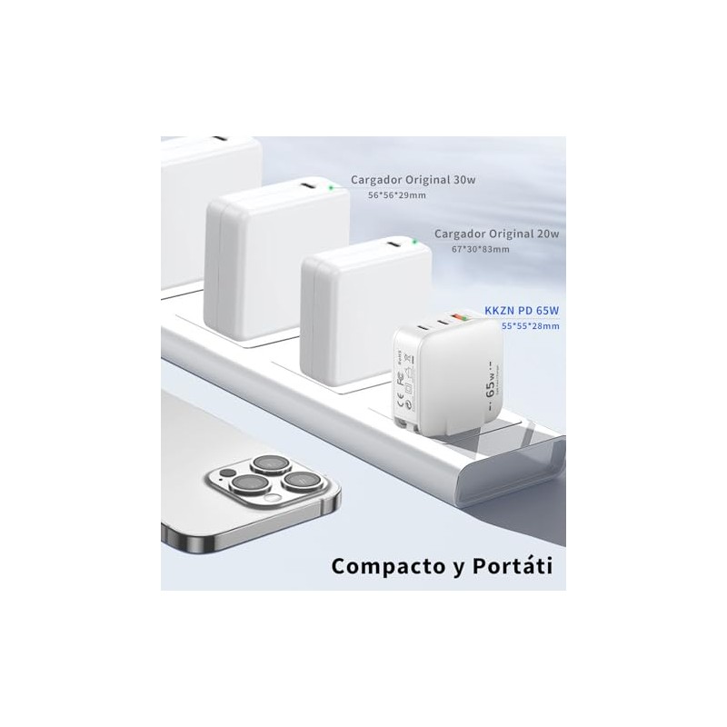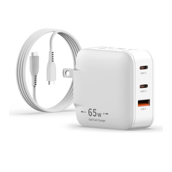 KKZN 65W Cargador Carga Rapida,Mini GAN Cargador Portátil con 3 Puertos de Carga con Cable de Carga de 2m,Compatible con MacBook Pro/Air M2,DELL XPS,iPad Pro,iPhone16 15 14 Pro,Galaxy S25 S24(Blanco)