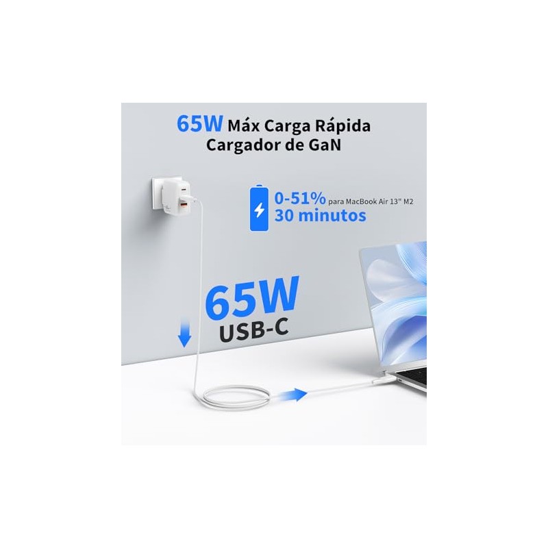 - 【Carga Rápida de 30 Minutos】Potencia de salida de hasta 65 W. Si su teléfono tiene un puerto de carga USB C y admite una potencia de 65 W, solo se necesitan 30 minutos para cargarlo por completo usando solo este cargador.