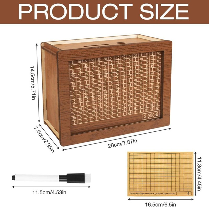 Klabsi Money Box with Number Check, Reusable, Wooden Cash Storage Box with Saving Target, €500 €1,000 €2,000 €3,000 €5,000 €10,000, Gift for Children, Teenagers and Adults