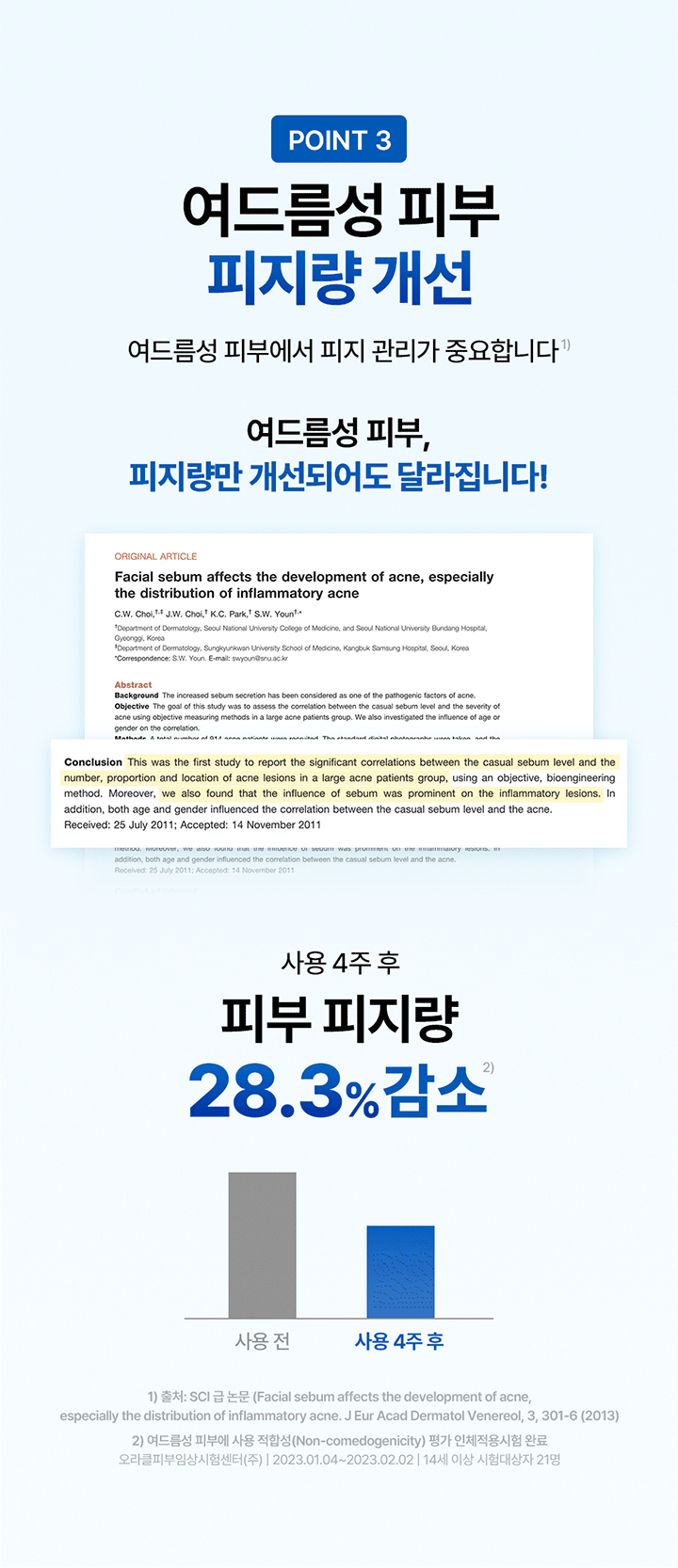 | 사용할 때 주의사항 | 1. 화장품 사용 시 또는 직사광선에 의하여 사용부위가 붉은 반점,부어오름, 가려움증의 이상 증상 등이 있는 경우 전문의 등과 상담하십시오. 2. 상처가 있는 부위 등에는 사용을 자제 하십시오. 3. 보관 및 취급 시의 주의사항1) 어린이의 손이 닿지 않는 곳에 보관하십시오.2) 직사광선을 피해서 보관하십시오.3) 눈 주위를 피하여 사용하십시오. |