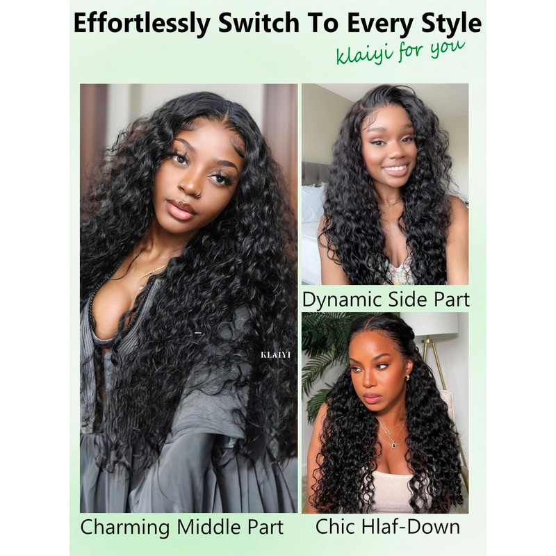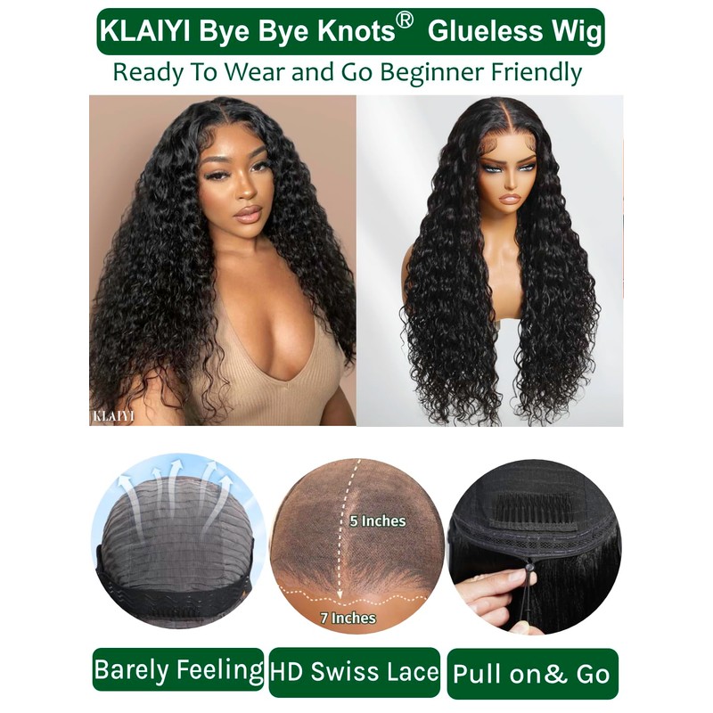 KLAIYI Water Wave Bye Bye Knots Glueless Wig Human Hair 7x5Precut Lace Front Pre Plucked Bleached Wear and Go Wig with Curly Baby Hair Drawstring 3S Ready to Go Pre Everything Beginner Friendly 16Inch
