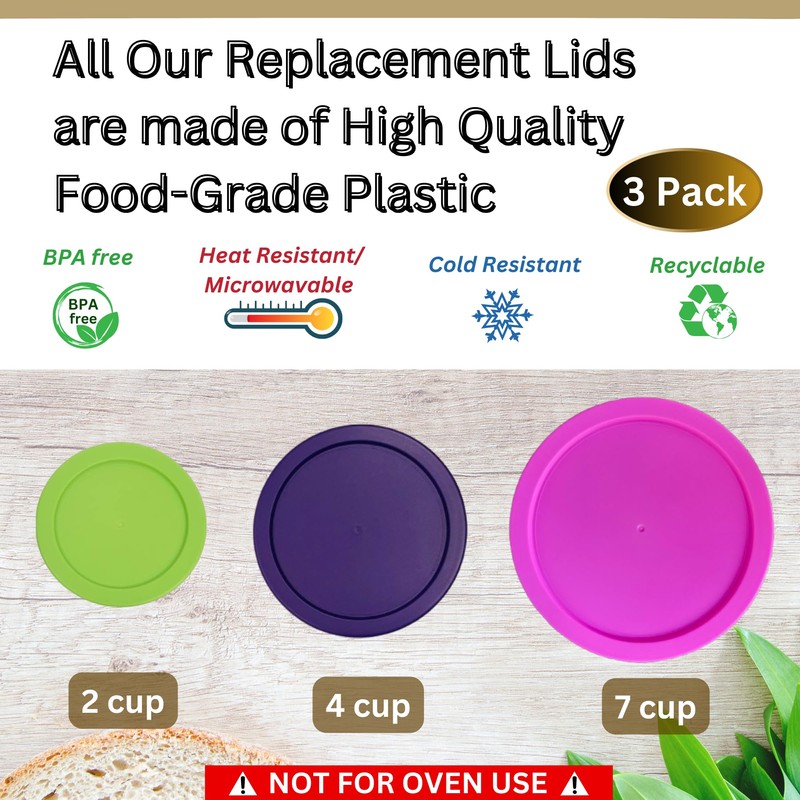 Klare Ware 2, 4 & 7 Cup Replacement Lids/Covers for Pyrex, Anchor Hocking & KlareWare Storage Bowls *Lids Only - Glass Container Not Included* (3 Pack *One of Each Size*, Spring Green, Purple, Pink)