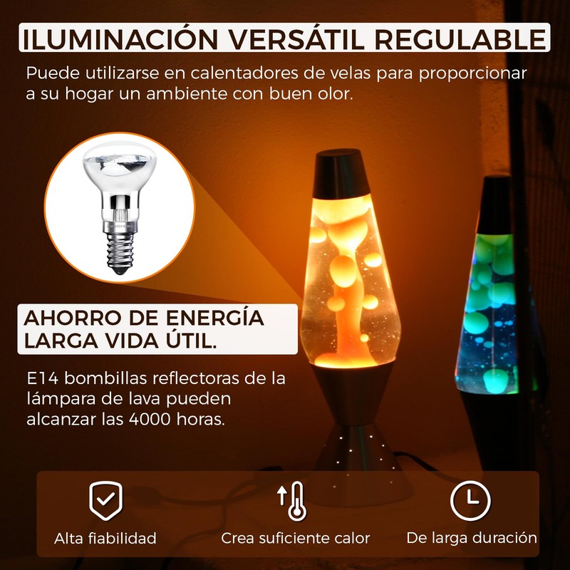 - Dimmable reflector bulbsThis R39 lava lamp bulb can be adjusted in terms of brightness to meet the user's different temperature requirements. The brightness can be continuously adjusted from 0% to 100% as required.