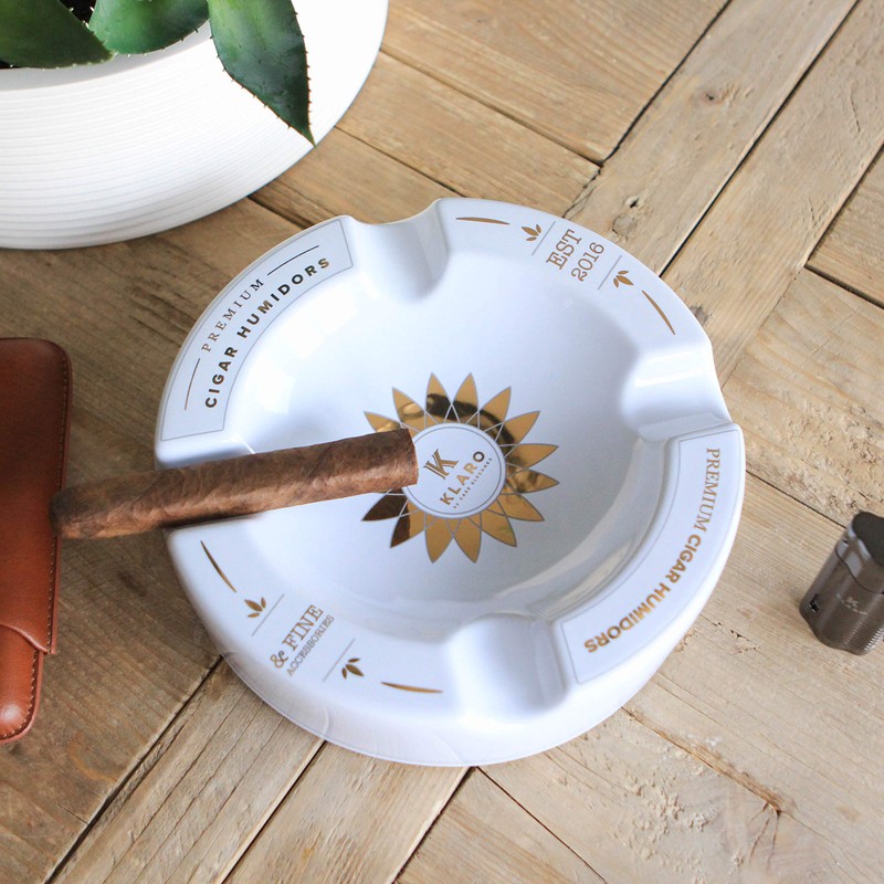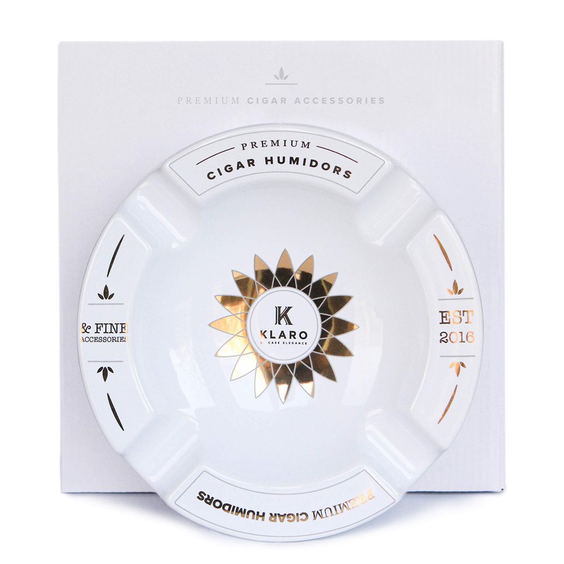 - MODERN DESIGN - The large round silhouette is a perfect ashtray for any gathering space. A stunning white glossy finish and minimalist decorative design makes this stand-out piece in your space. The bottom has four protective felt pads that prevent any scratching on your furniture. This ashtray will pair perfectly with any model of Klaro Humidors.