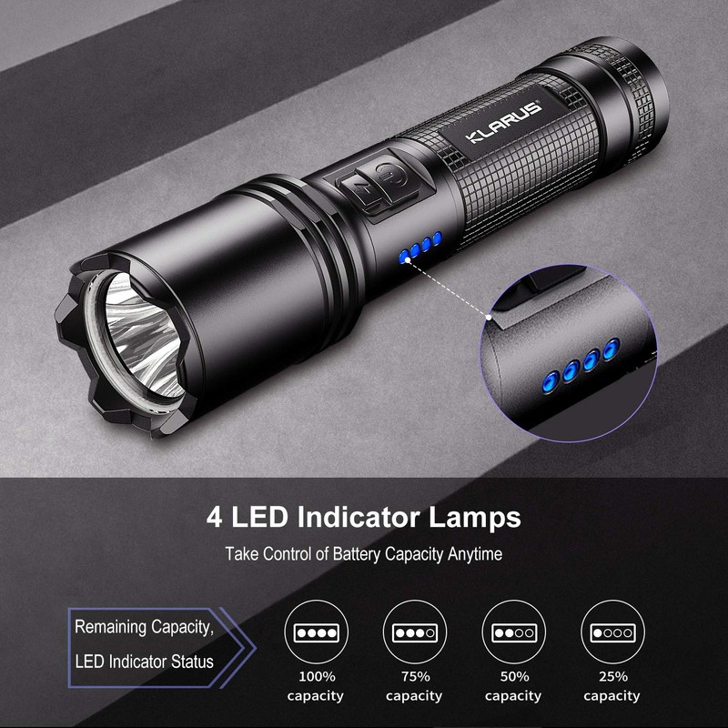 **KLARUS found in 2011, is dedicated to development new technologies and had done numerous innovations in flashlight. All of our products are designed and manufactured to not just great function but also be safe for their intended use. Quality and Safety for our consumers is Klarus top priority.** **EP10 is high powered Dual Side Switches Tactical flashlight, very compact and heavy duty super bright, and conveniently rechargeable.** ● Equipped with a 10W High-power LED, delivers a maximum output of 1000 lumens; a maximum beam distance of 210 meters ● Features dual side switches: Independent Strobe switch and Independent ON/OFF(Mode) switch. ● Mode memory function: Light press the on/off switch to change modes, EP10 will go into its last used mode at the next time. ● The Strobe function is intended for instant self-defense purposes. ●Multi-purpose with clear, versatile functions: Straight to Strobe, Instant on, 3 normal lighting brightness with memory Function, Battery Capacity Indicator, USB C Rechargeable, Easy Mode Change. ● 4 Lighting Modes including Flashing Mode: ● High (1000 lumens) - 3.3 hours runtime ● Medium (200 lumens) - 11 hours runtime ● Low(30 lumens) - 72 hours runtime ● Strobe (1000 lumens) - 6.6 hours runtime **Dimensions:** Length: 160.5mm /5.59in Head Diameter: 35.0mm /1.37in Body Diameter: 25.4 mm /1in Weight: 175g /6.17oz(without battery) **Package List:** 1 x EP10 1000 Lumens Tactical Flashlight 1 x 2600mAh IMR 18650 Battery 1 x USB C Charging Cable 1 x Klarus Lanyard 1 x Spare O-ring 1 x User Manual **Warranty:** 1 Year