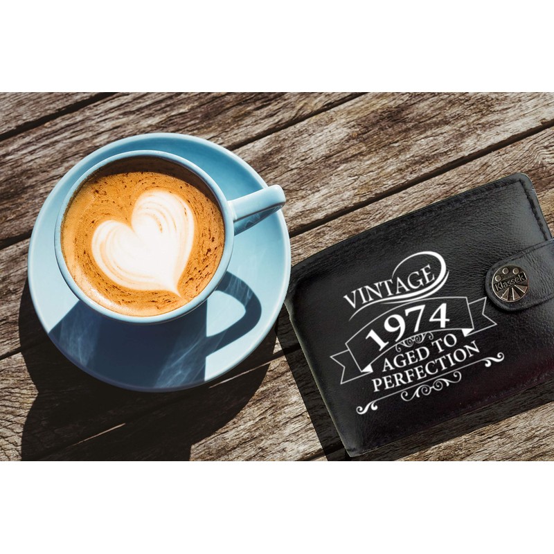 Klassek 1974 Birthday Aged to Perfection Mens Wallet with Chain Real Leather RFID Blocking with Coin Pocket and Metal Gift Box