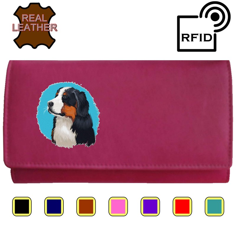 Klassek Bernese Mountain Dog Womans Pink Purse Dog Lover Owner Brand Image on Real Animal Leather RFID Puppy Accessory Gift
