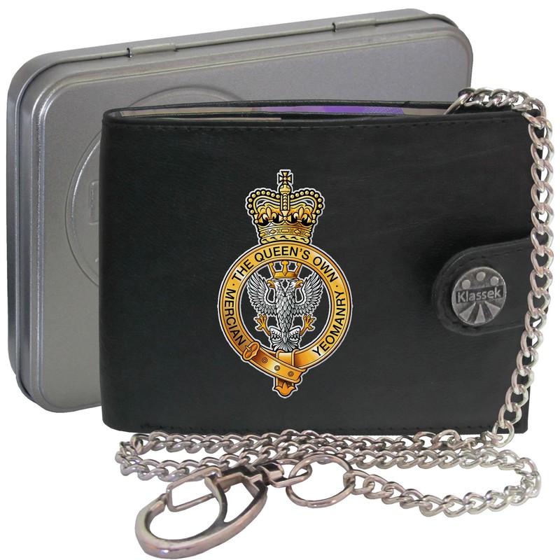The Queen's Own Mercian Yeomanry image KLASSEK Men Chain Wallet Real Leather Cap Badge Emblem Military Crest Insignia RFID Blocking with Coin Pocket and Metal gift Box.