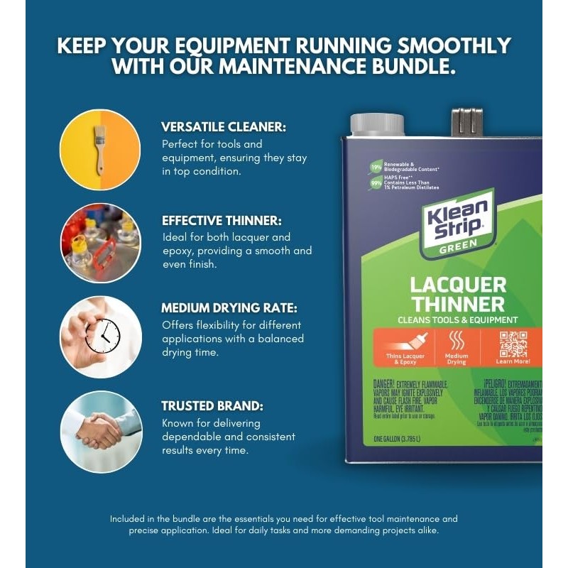 - RELIABLE PERFORMANCE - Klean Strip, the top choice for pros and DIY'ers, offers dependable solvents, thinners, removers, and cleaners. Trust Klean Strip Green Lacquer Thinner for reliable results every time.