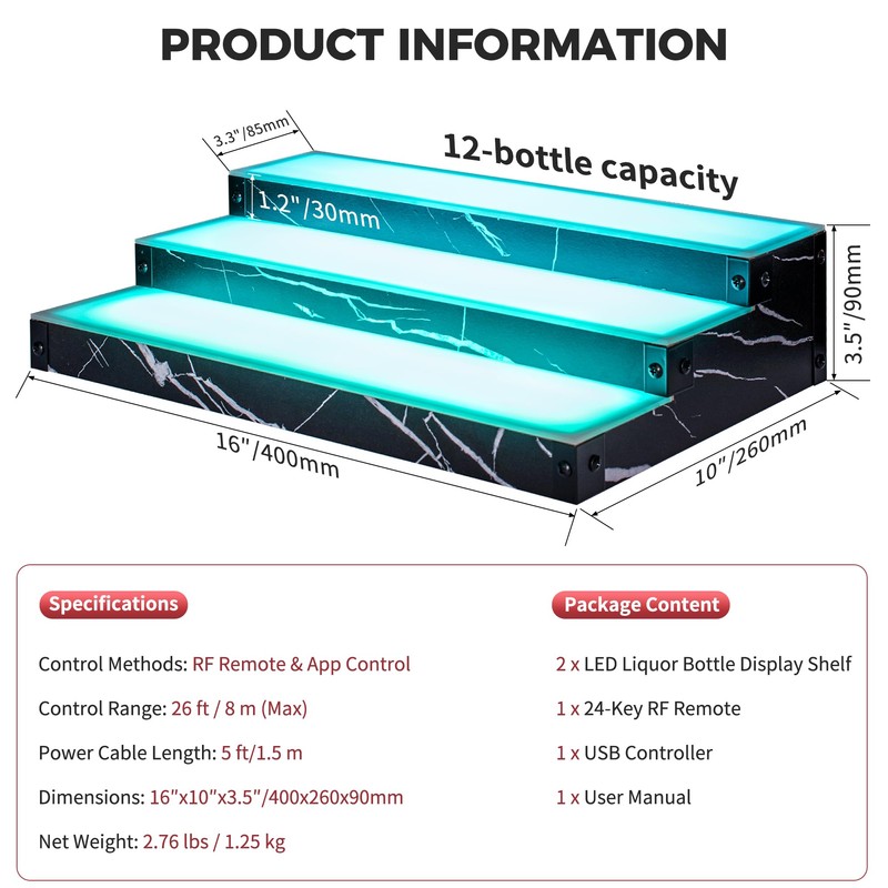 • 2-Pack, 3-Tier StorageEach shelf measures 16 x 10 x 3.5 in and holds 12 bottles24 in total. The non-slip design keeps bottles steady, making your liquor the glowing centerpiece of any bar.