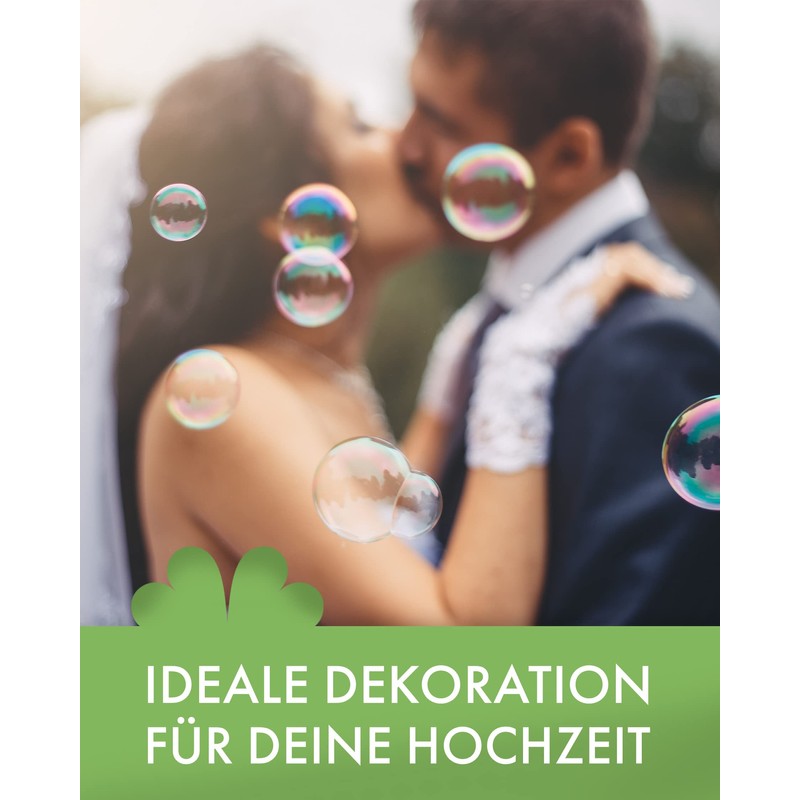 • The Kleenes Traumhandel wedding bubbles are perfect as an alternative to thrown rose petals or rice grains. Each guest receives a tube, and as soon as the wedding couple leaves the registry office or church after the wedding, the bubbles are blown over the newlywed couple. Thanks to the applicator, this is very easy.