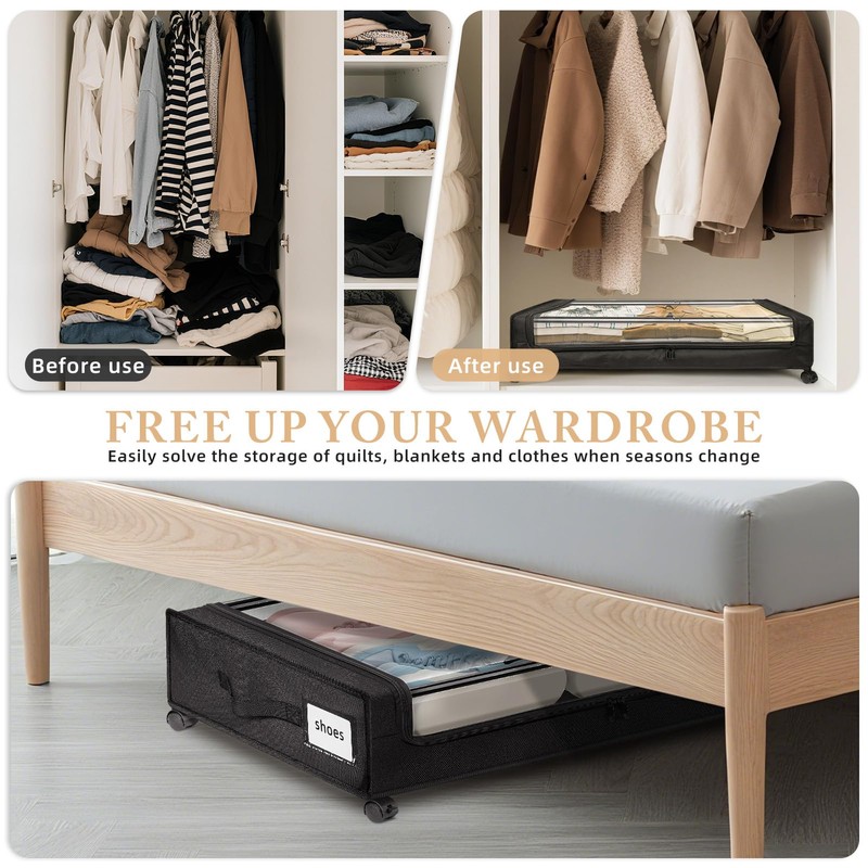 - [100L Large Capacity (2-Pack)]This 2-pack under bed storage set offers 100L total capacity—each bin holds 1 thick winter comforter, 3 summer blankets, 30 summer clothes, or 6 adult shoes. Perfect for seasonal storage (winter coats, summer linens) to free up space in closets, shoe racks, and bookshelves. Eliminate clutter and keep dorms, bedrooms, and living rooms bright, cozy, and tidy. A must-have under bed storage solution for small spaces.