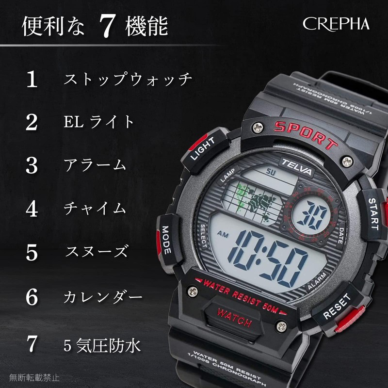 - Waterproof/Function: Enhanced water resistance for everyday use (5 ATM), Time display (hour, minute, second), 12/24 hour display switch, Calendar display (month, day, day, week), Stopwatch (Maximum measurement time: 23 hours 59 minutes, 59 seconds, 99 inches), Alarm (ON/OFF), Hourly time signal (ON/OFF), EL light