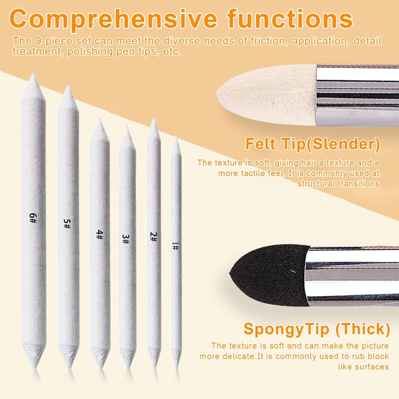 - Packing list: you will receive 9 pieces estompen set, including 2 pieces black sponge erasers, 6 pieces paper erasers, 1 piece pencil emery board, complete accessories, sufficient quantity, easily meet the needs of different drawing style use