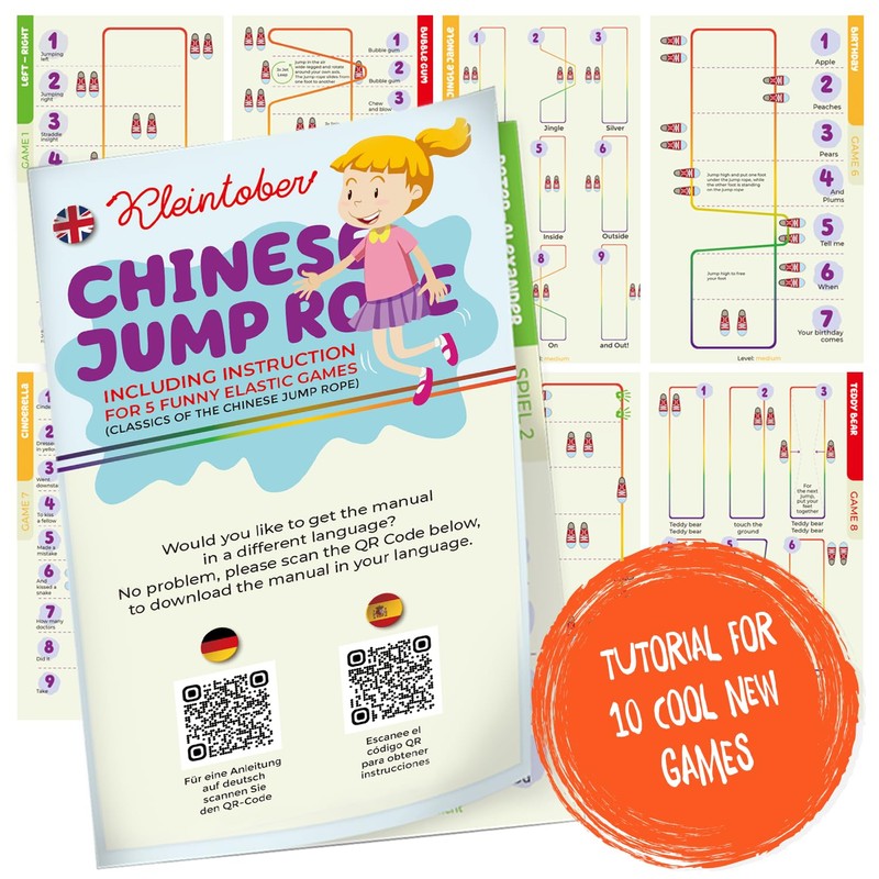 - 🪢 EXCEPTIONAL CHINESE JUMP ROPE: Here we go, the KLEINTOBER elastic Chinese jump rope is just the thing for you! The set not only includes a jump rope kids will love, but also awesome instructions for 5 jump rope games and rhymes.