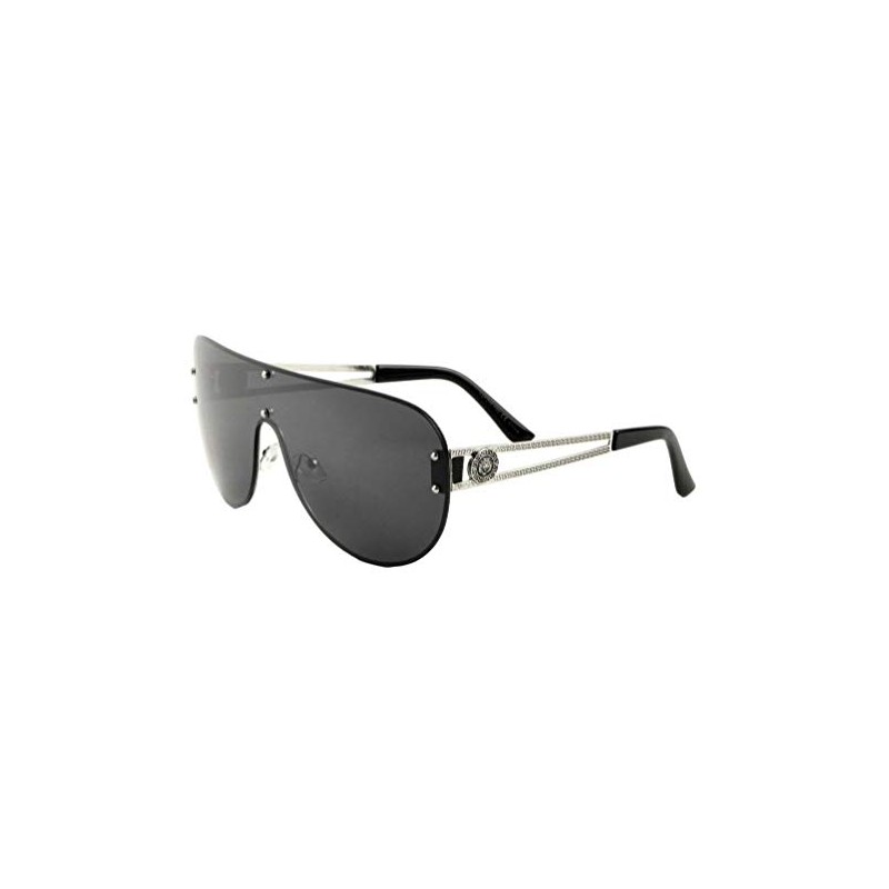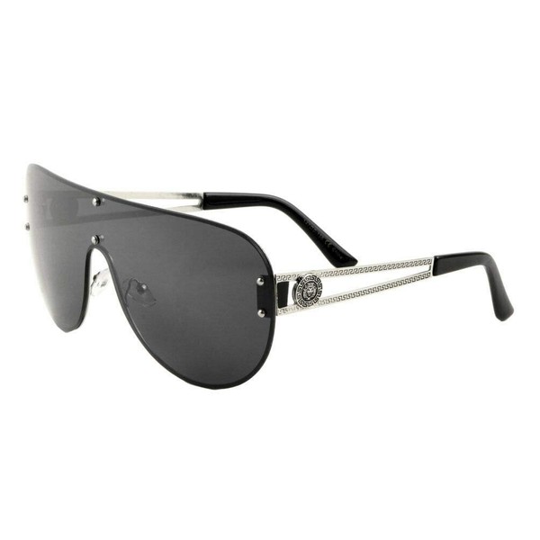 Kleo Lion Head Medallion Oversized Flat Top Luxury Shield Aviator Sunglasses (Silver Metallic Frame, Black Super Dark)
