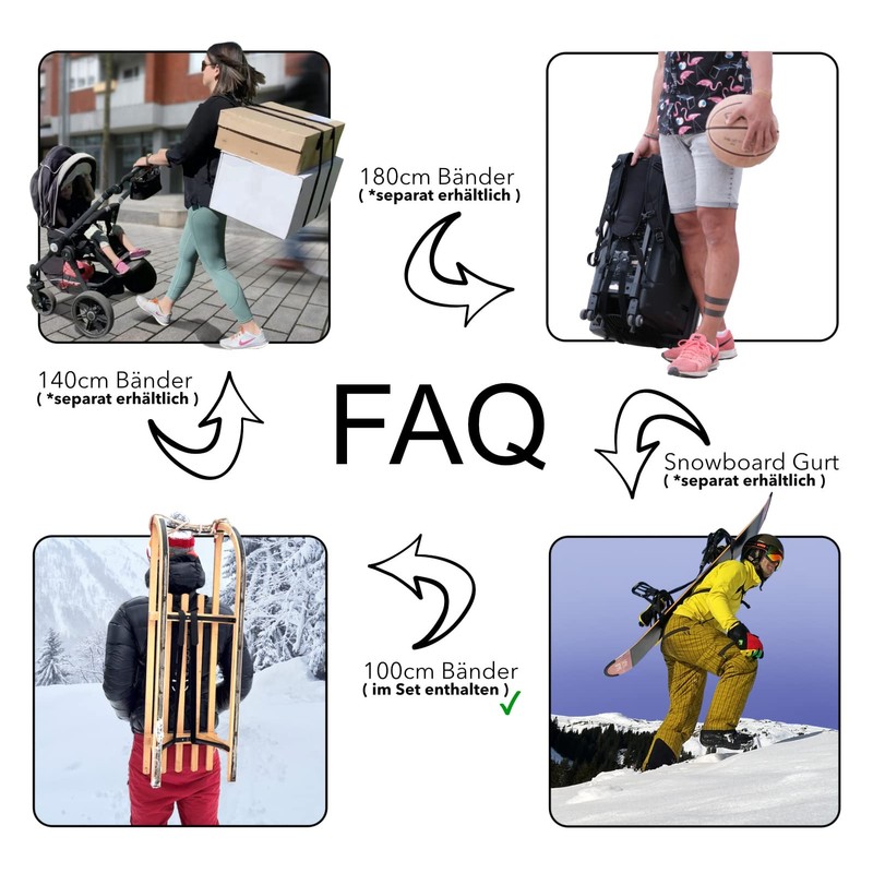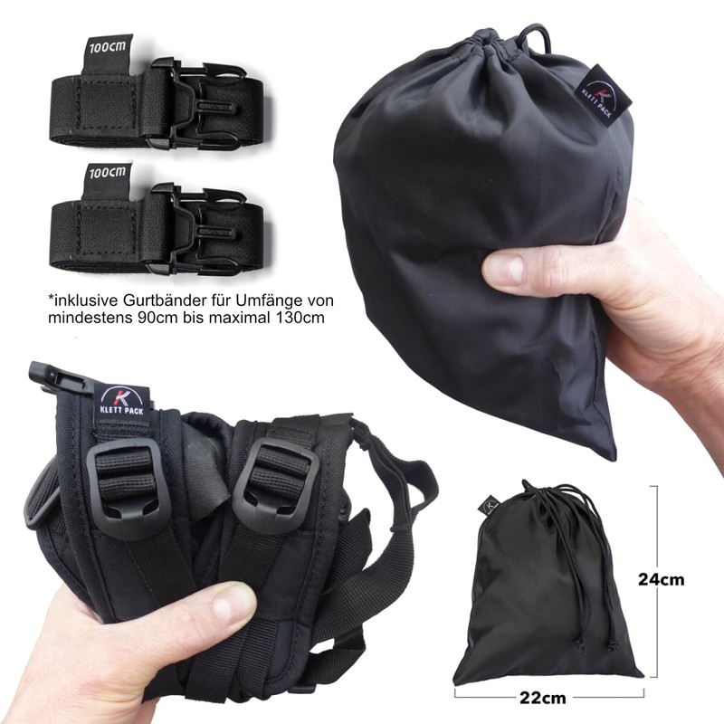 - Flexible to wear: the enclosed webbing (100 cm), can firmly enclose shape sizes of at least 90 cm and a maximum of 130 cm circumference. Separately available accessories can include sizes up to 280 cm circumference or a snowboard.