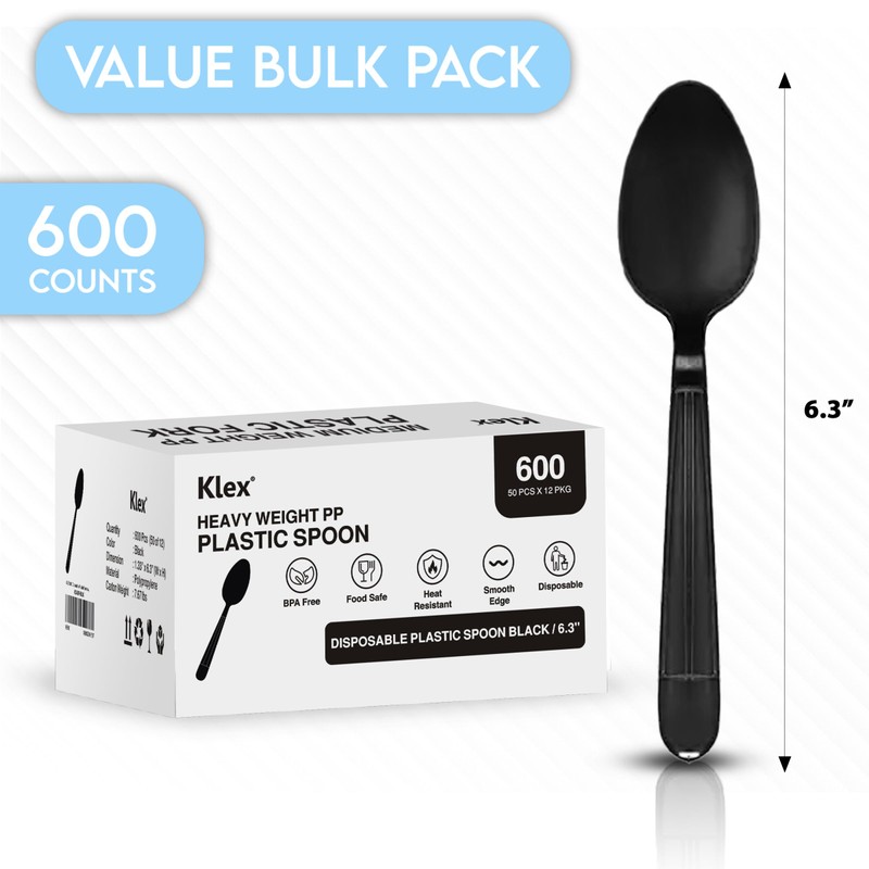Klex 600 Disposable Plastic Spoons Heavy Weight with Heat Resistant, BPA Free Durable Spoon Bulk, 6.3", Black, 600 Count