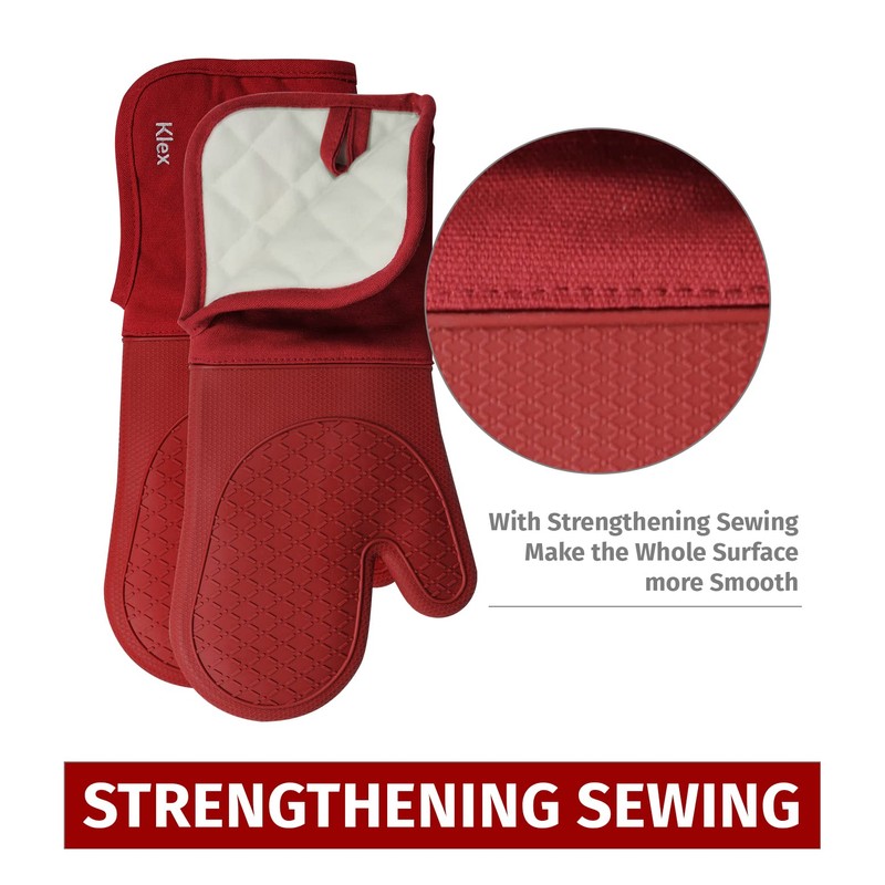 - Extra long 15 inches : klex oven mitts can coverage from finger to elbow. It can decrease the chance of burns on the wrists and forearms when reaching into an oven or burns that can occur when your outdoor grill experiences a flare-up