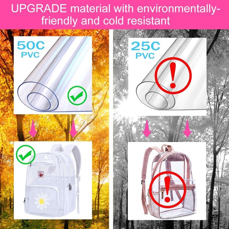 - Durable Transparent Backpack: Thickened 50c premium PVC, reinforced the linking point of straps to backpack, added bottom polyester lining make this clear backpack even longer-lasting and more durable!