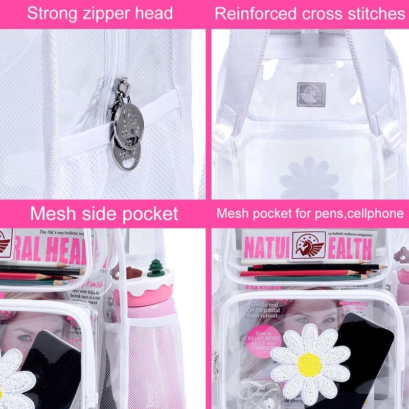 - Comfortable Girls Clear Backpack: Widened and padded straps reduce shoulder strain, smooth zippers, finely stitched handles and side mesh pockets make this clear school backpack a pleasure to use.