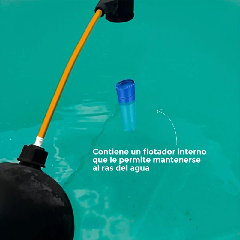 - Contiene un flotador interno que le permite mantenerse a ras del agua y aplicar desde arriba el ingrediente activo, además su dosificación permite una duración de 3 meses aproximadamente.