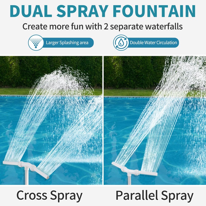 - [Innovative Dual Spray Fountain] - Integrated 2 waterfalls spraying from 1 pool outlet, splash double water volume into air, fastly cool down your pool by creating a falling water wide and high, bring a soothing sound to calm down quickly and release pressure from life. Attach directly to pump return outlet, cost no extra power