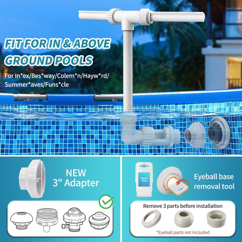 - FIT ABOVE INGROUND POOLS - New 3” thread adapter included to fit above ground pools with 1-1/2” and 1 1/4” inlet fittings. The equipped 1.5” fountain thread will fit inground pools regular pool return jets. Eyeball base removal tool also included to help unscrew the return part and install the fountain connector