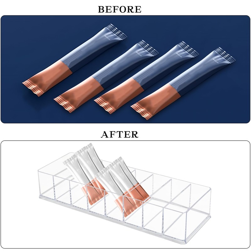 - Package Include: You will receive 2 clear drink packet organizers with 8 compartments, perfect for kitchen, countertop, cabinets, pantry, fridge, drawers, coffee bar and more. Make your countertop look neater.