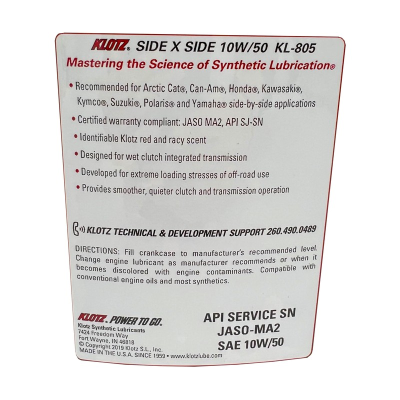 - Klotz Synthetic Motor Oil is designed specifically for the unique performance requirements of Side-by-Side ATVs to provide outstanding oxidation performance and detergency during extreme loading or off-road use. Our oil change kits prevent wear and provide corrosion protection for the engine hardware with just the right amount of lubricant – no more, no less.
