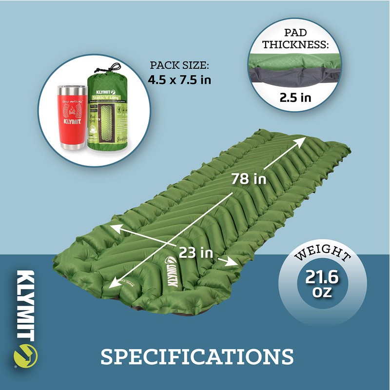 KLYMIT STATIC V LONG (78”) Sleeping Pad, Lightweight, Outdoor Sleep Comfort for Backpacking and Hiking, Inflatable Camping Mattress for Tall Campers