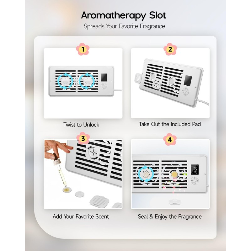 - 【Breathe Better, Smart Air & Scent in One Fan】This register booster fan not only intelligently detects room temperature and automatically starts operating to quickly balance indoor airflow, but it also features a built-in aroma compartment for a personalized scent experience. Simply add your favorite perfume or essential oil to the included four replaceable cotton pads, and refreshing fragrances will naturally diffuse with the airflow, filling your space with pleasant aromas.