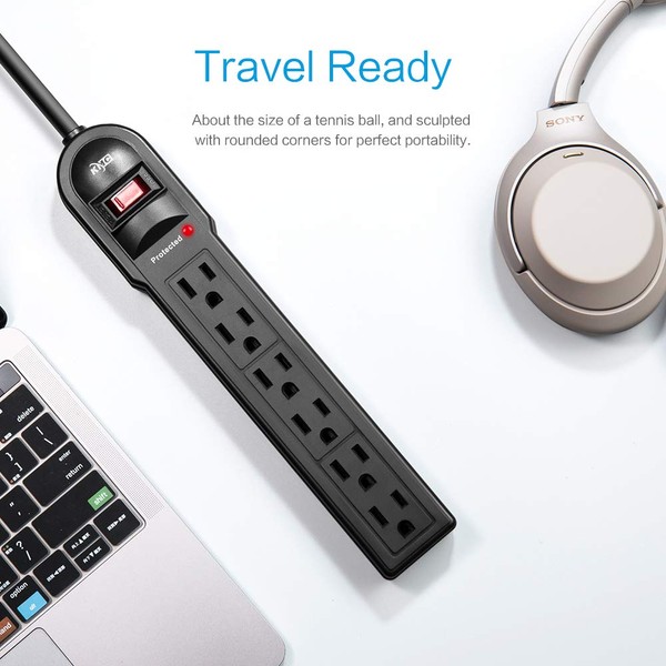 The 6-outlet power strip with 2 foot, the power strip whole body is black and only one switch, easy to operate.