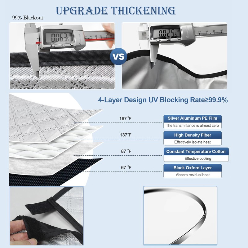 - 【Upgraded Thicker Sun Visor】: The car window shades are upgrade diamond pattern thickened insulation cotton. In addition to the 310T reflective polyester on the surface, which can effectively block 99.9% of uv and sunlight, the high-quality cotton layer is also added in the middle, which can reflect and absorb heat to ensure high-quality thermal insulation. Maximum durability and sturdiness at the same time.