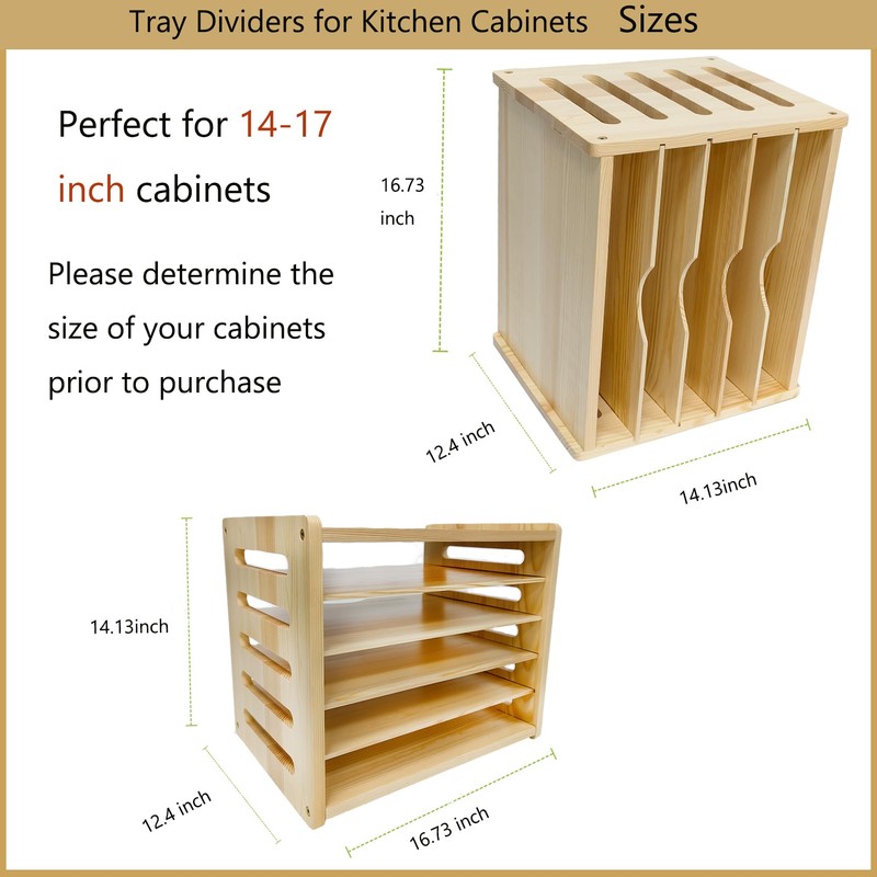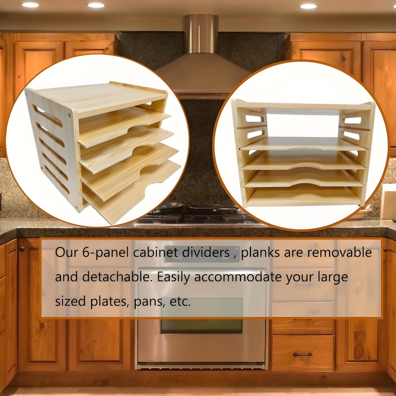 - 6 TIER CABINET TRAY DIVIDERS DETAILED PARAMETERS: Our wood cabinet divider size is: 16.73inch x 14.13inch x 12.4inch, the gap size of the divider is: 2.5 inch. Please make sure the size of your cabinet, if your cabinet is big, you can choose two.6 tier cabinet divider, it can easily help you to organize your cabinets, the divider is pull-out and removable, you can decide the position of the placement freely.