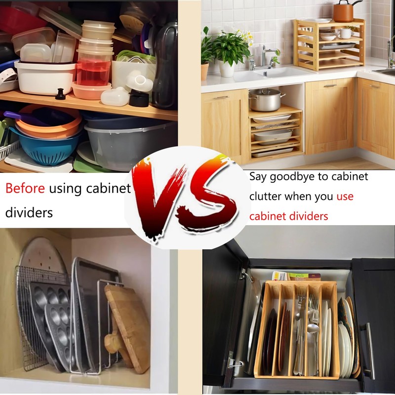- SUPERIOR QUALITY: The cabinet dividers are made of the best wood, durable, waterproof and moisture-proof, with advanced cutting process and very smooth painted surface. Say goodbye to the trouble of baking pans and cutting boards piling up all over the cabinets.