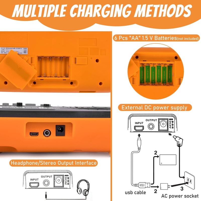 - Audio Output:This 32-key keyboard can be connected to headphones, beginners can monitor while playing; the keyboard has built-in speakers, and can also be connected to speakers to enhance the sound effect
