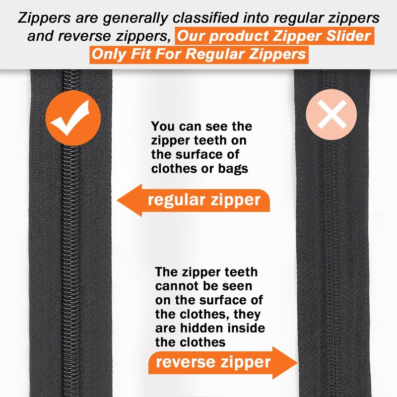 - Important Note: Zippers are generally classified into regular zippers and reverse zippers, the zipper sliders of these two types cannot be used interchangeably. Our Product Zipper Sliders Only Fit For Regular Zippers (Refer to Image 4). Please check your zipper type before purchasing our product.