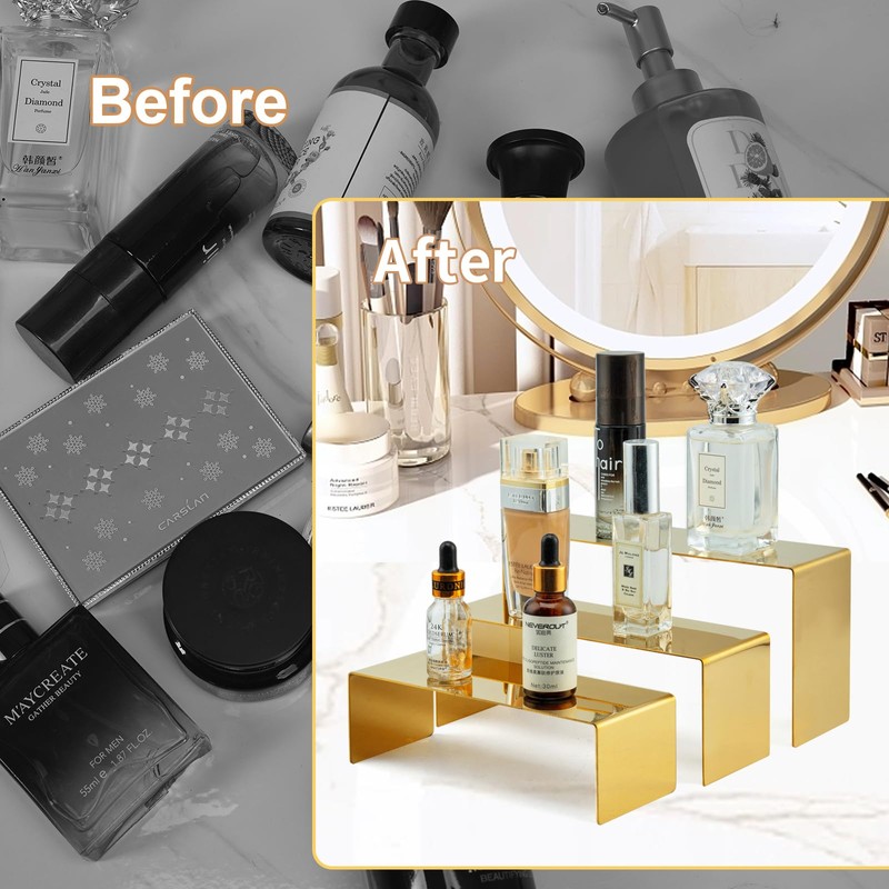 KMtilshGold Stainless Steel Purse Display Rack with 3 Heavy Duty Countertop Heightened Shelves for Organizing Shoe Racks, Purses, Home Boutiques, Displaying Perfumes, Handbags, Jewelry